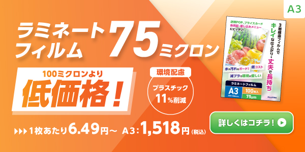 a3サイズラミネートフィルム(303×426mm)一覧です。各種厚み、素材のラミネートフィルムを取り揃えています。