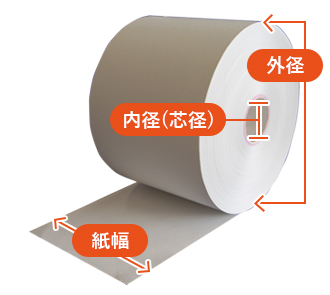 サイズラインナップは、「用紙幅」「外径」「内径(芯径)」と少しずつ異なりますので、ご注文の際は十分お確かめの上、お手続きをお願い致します。