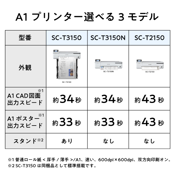 同梱品 ・インクカートリッジ(初期充てん用)(50ml)1本(マットブラック)・インクカートリッジ(初期充てん用)(26ml)3本(イエロー、シアン、マゼンタ)・約50mm紙管ロール紙用スピンドル1本・ソフトウェアCD-ROM・取扱説明書・排紙スタッカー・スタンド(SC-T3150のみ)