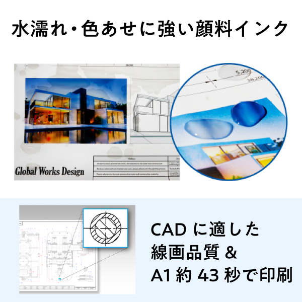 水濡れ・色あせに強いCAD図面や販促ポスターを実現ガタツキや文字つぶれのないはっきりとした線画や、水濡れ、色あせに強い販促ポスターを手軽に印刷できます。使いやすさにこだわり
