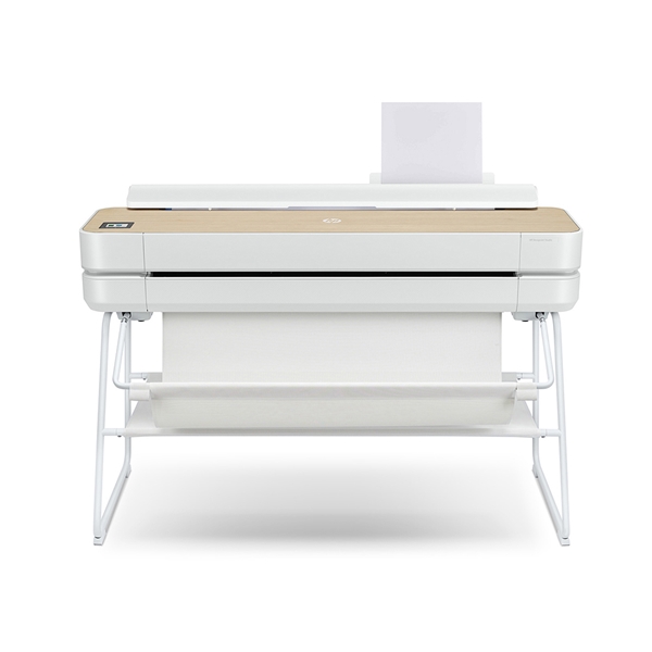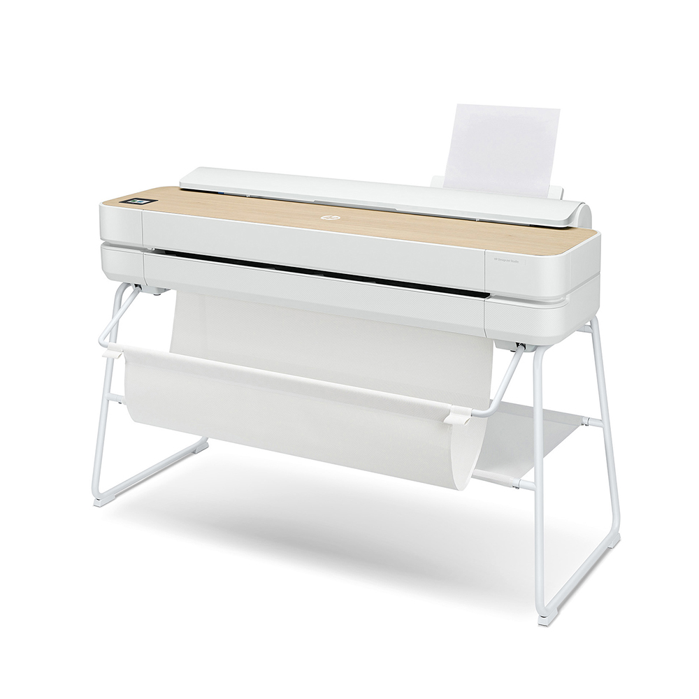 真っ白なボディーに木目調のトップカバーと斬新かつスタイリッシュなビジュアルの大判プリンターHP DesignJet Studio。