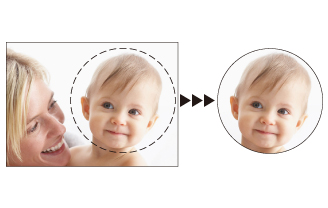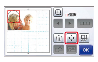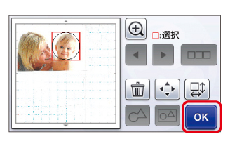 切り抜きたい部分に模様を配置し、「OK」キーを押します。ここでは、赤ちゃんの顔を○の模様で切り抜きます。