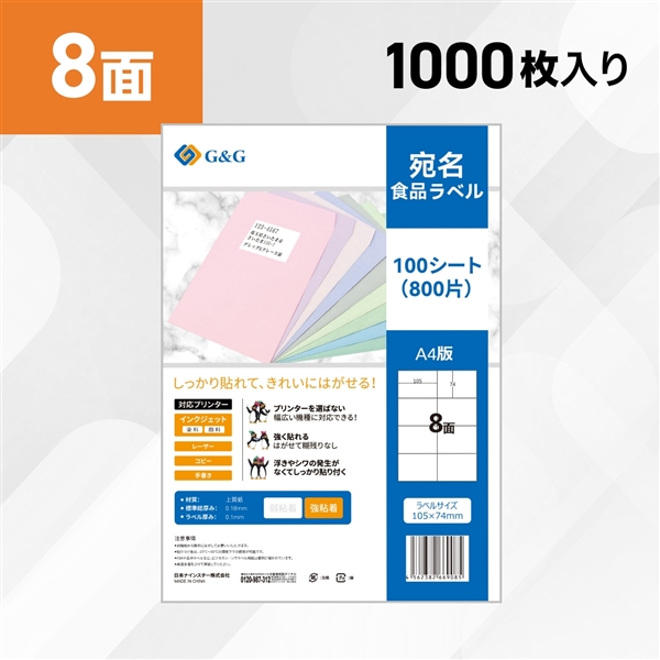 ラベルシール 8面 100枚入り A4サイズ RL-A4-08-W1 100シート (NSL08)