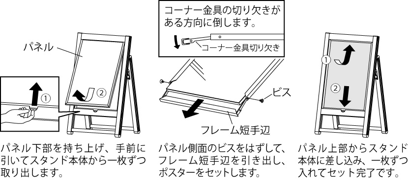 3種のポスター入れ替えが簡単に行えます。タイムサービスメニューやイベントの案内におすすめです。