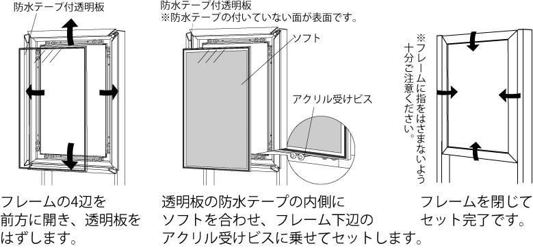 素材 フレーム:アルミ押出材 アルマイト仕上/面板:1.5mm透明アクリル防水テープ付き 3mmアルミ複合板/脚部:アルミ押出材 アルマイト仕上 キャスター付き
