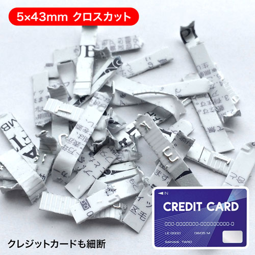 細断形状は5×43mmのクロスカット。ゴミ箱からの情報漏洩を防ぎます。用紙の投入口からカードも細断できます。